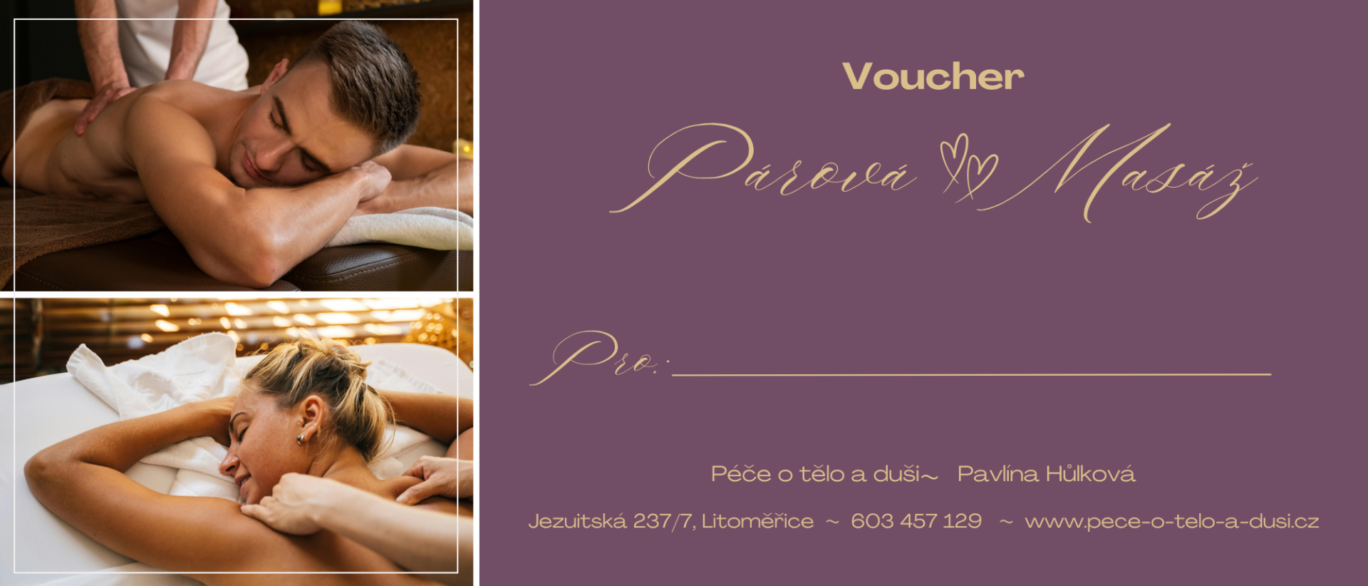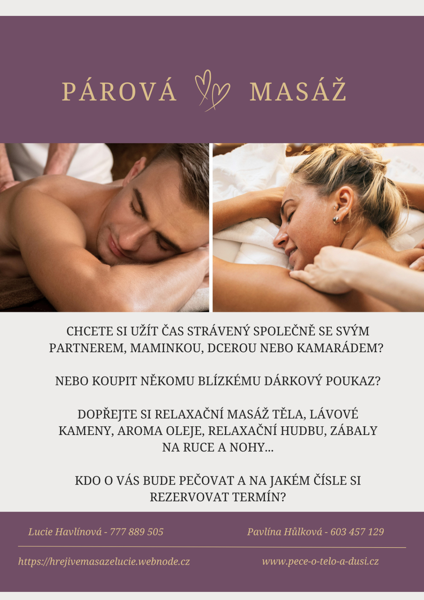 Párová masáž je společný zážitek, který umožňuje sdílet chvíle klidu, uvolnění a blízkosti. Je vhodná pro partnery, přátele, maminku s dcerou nebo kohokoliv, kdo si přeje prožít relaxaci společně.